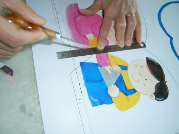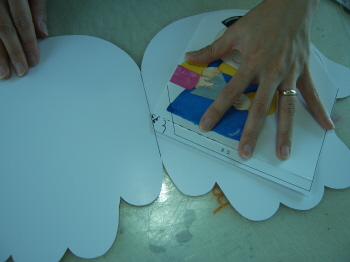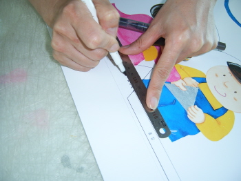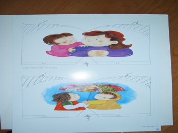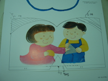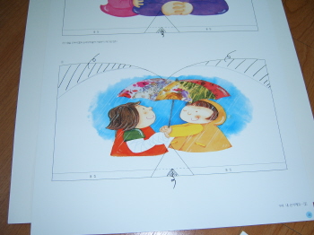 | 9-3-1: 손그림의 안쪽 중아에 선(9-2-1)을 표시해서 풀칠해서 붙일 때 기준이 되게 한다. |  수정된 그림을 손 그림에 붙인다. 손 그림은 반으로 접어 중앙의 접는 선을 표시해둔다. |