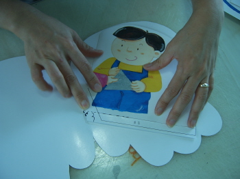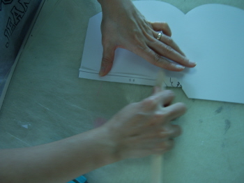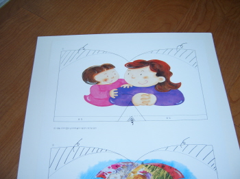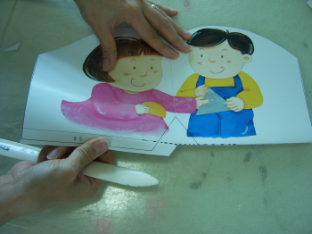 | 9-2-1: 책 그림의 중앙에 송곳으로 접는선을 만들어 접어준다(내용그림을 붙일 때 기준선이 된다.). |  각 그림들이 잘 접어지도록 약하게 송곳으로 그어준다. |