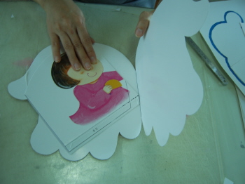 | 9-3-3: 접어서 그림을 풀칠한 면을 눌러준다. |  풀칠한 면이 잘 붙도록 손을 접어준다.  풀칠한 면이 잘 붙도록 잘 눌러준다.  풀칠한 부분들이 잘 붙도록 접어서 눌러준다. |