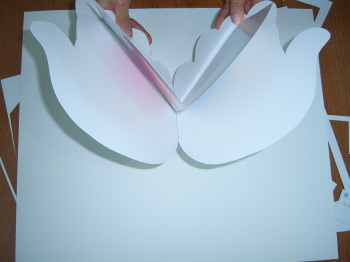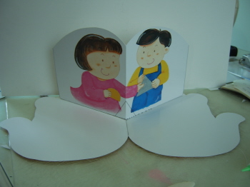 9-4) 완성그림 손 모양의 종이를 두꺼운 색지로 2장 더 만들어 준비한 후, 각각의손 바닥에 동일한 방법으로 내용 그림을 붙여간다. |  동일한 방법으로 다른 그림들도 붙인다. 배경 손그림은 두꺼운 색지로 2장더 만든다.  위에서 본 그림 |