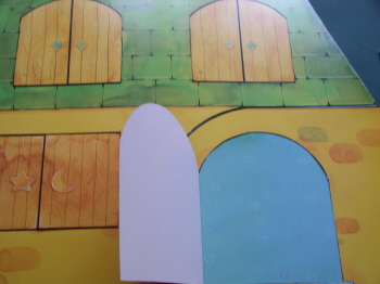 18-13 중간대에 붙여놓은 예수님을 붙일 위치를 정한 다음 d부분에 풀칠을 해서 하늘색 배경에 붙인다.